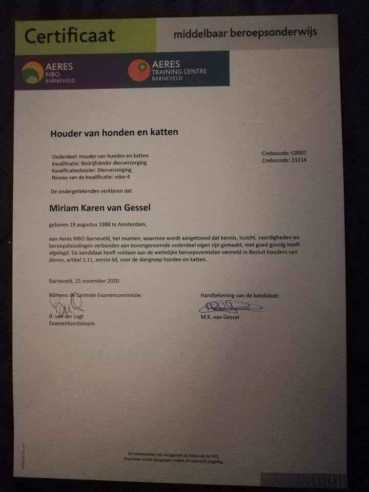 Onder het norm nooit te oud om te leren! zal ik in de toekomst mij blijven ontwikkelen op het gebied van Honden, Katten en Konijnen/Cavia's.